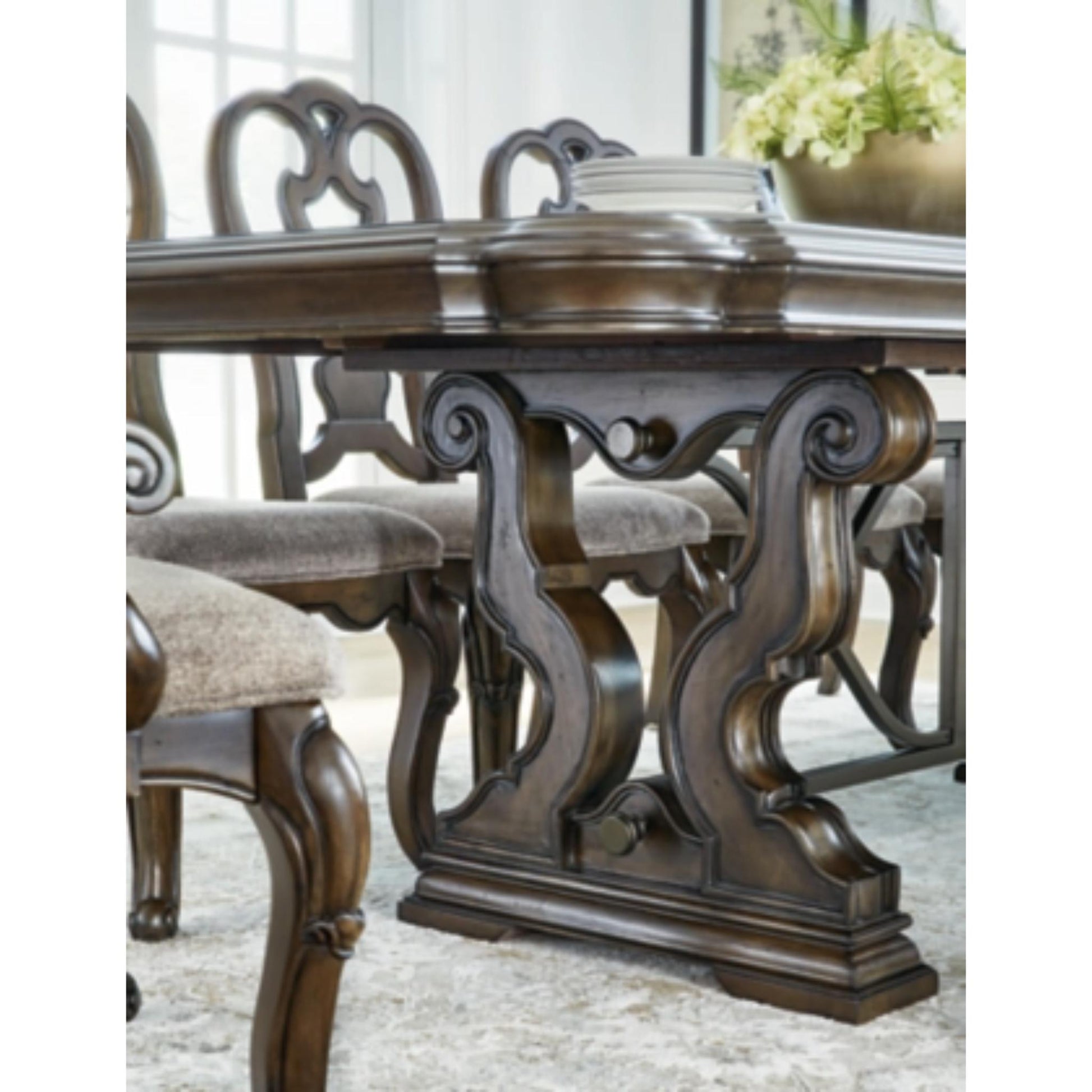 From its ornamental appliques to its large scale, this dining package makes a bold statement. With ornate details, the opulent set wows with stunning style. The look is timeless. The feel? Right at home.