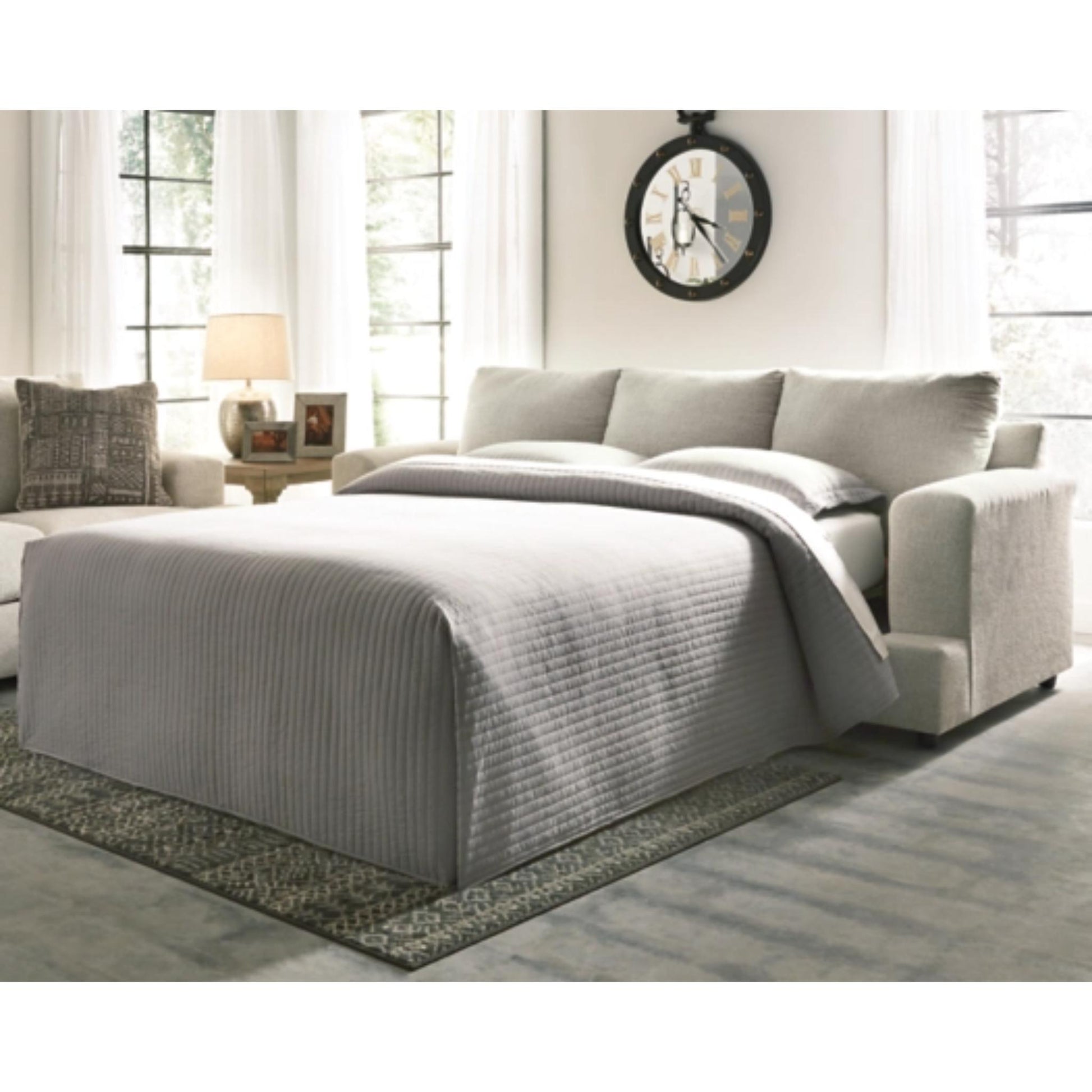 Flaunting a trendsetting silhouette, this sofa sleeper puts the contemporary in your contemporary home. Its “three over two” profile eliminates the center seat cushion, giving you elongated plushness and deep seating. And the chunky chenille fabric satisfies your need for a piece that feels as good as it looks. A pull-out queen mattress in quality memory foam comfortably accommodates overnight guests.