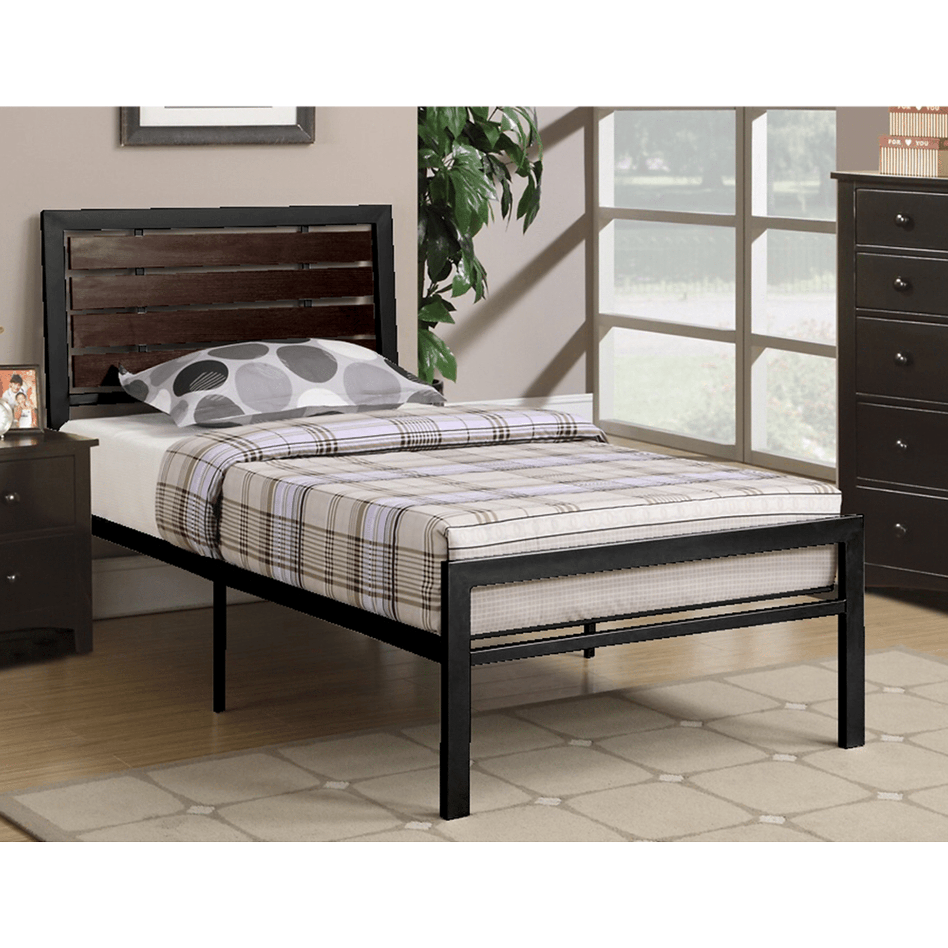 This platform bed effortlessly combines modern silhouette with traditional industrial style, making it a standout piece in your bedroom or guest room. The design offers ample space underneath the bed, perfect for tucking away boxes, quilts, or storage bins. Crafted with a black metal frame and espresso wood panels, this bed brings both durability and aesthetic appeal. The included steel slat kit eliminates the need for a box spring, offering sturdy mattress support right out of the box.
