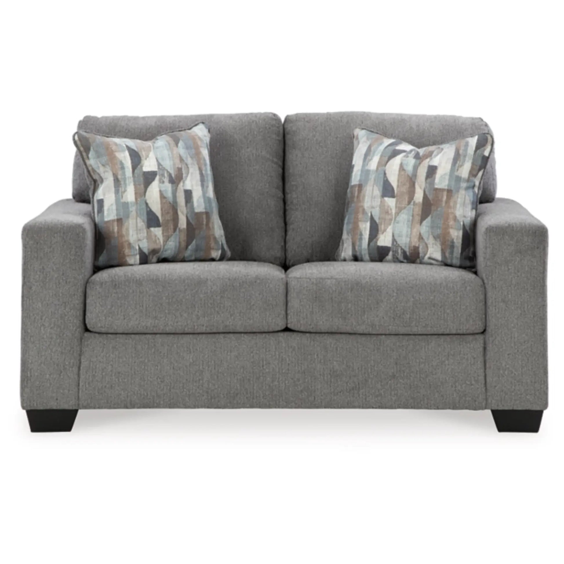 Youโre in for a neat treat with this loveseat. Its comfy seats are covered in soft, textural upholstery, and the wide track arms are eager to support your quest for total relaxation. Distressed abstract toss pillows bring a fresh breath of contemporary style while accentuating the loveseat's color.