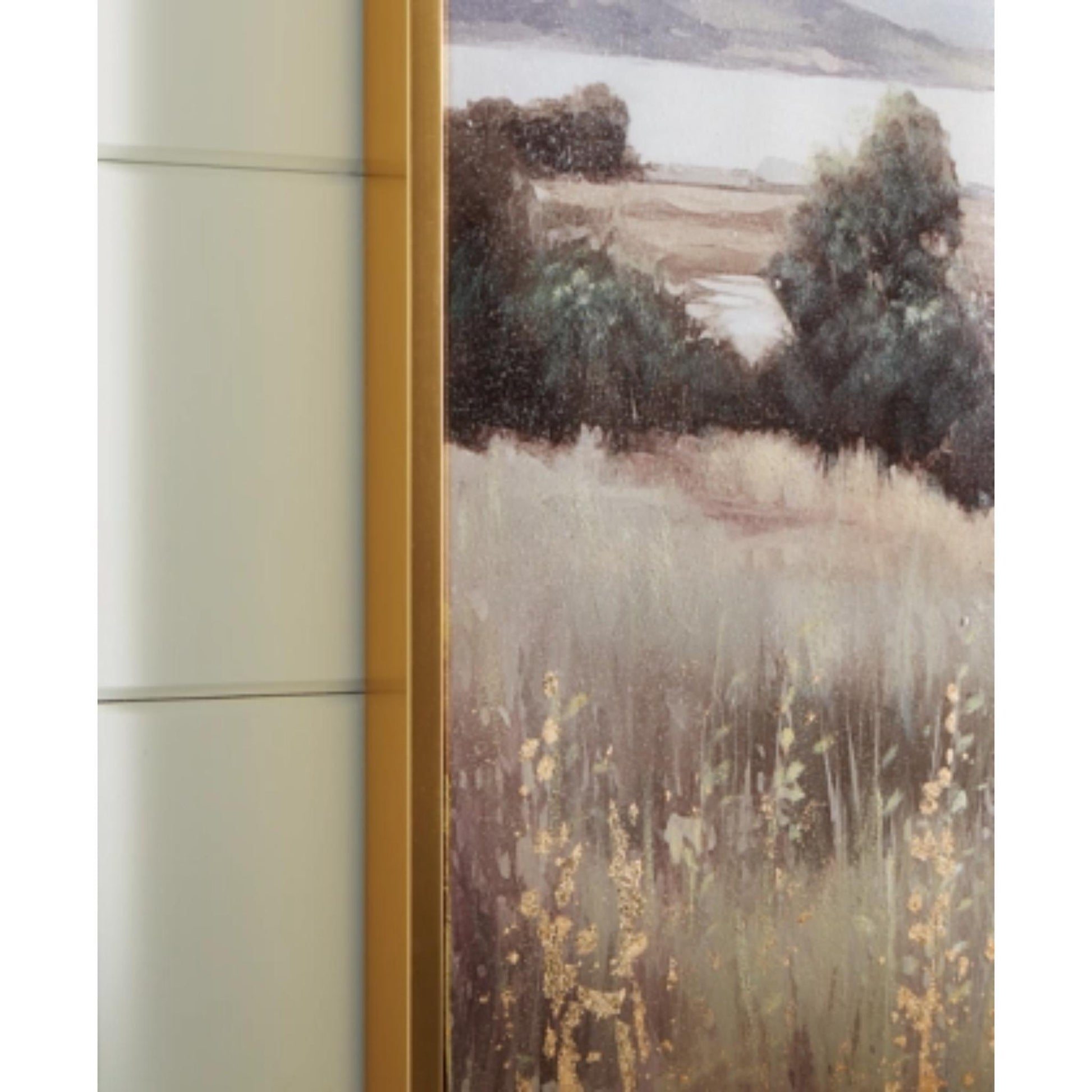 This wall art puts a peaceful spin on hanging decor. Its quiet landscape invites you to a lakeside field, with rolling mountains in the background that bring depth to the design. Hand-painted and gold leaf embellishments make each piece unique.