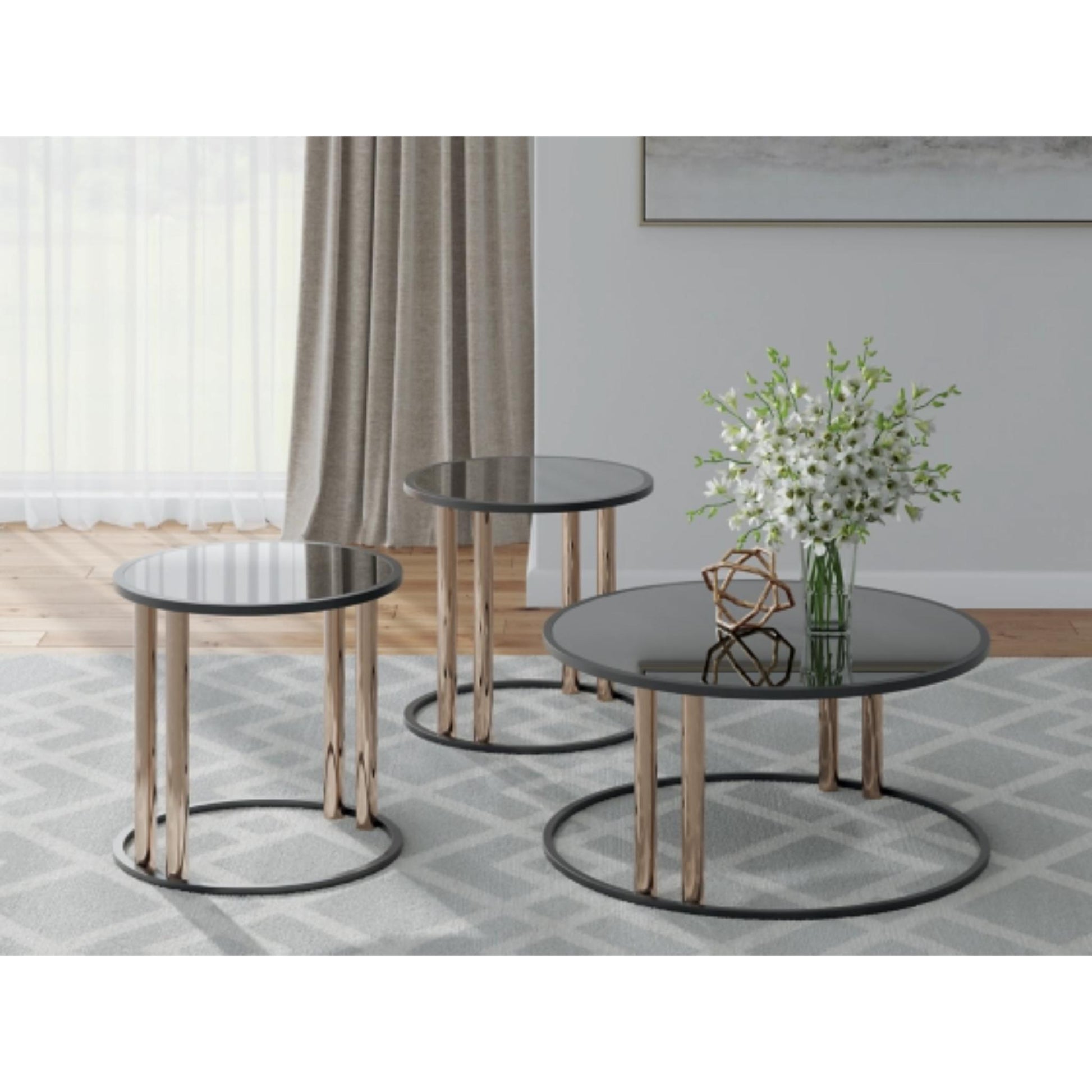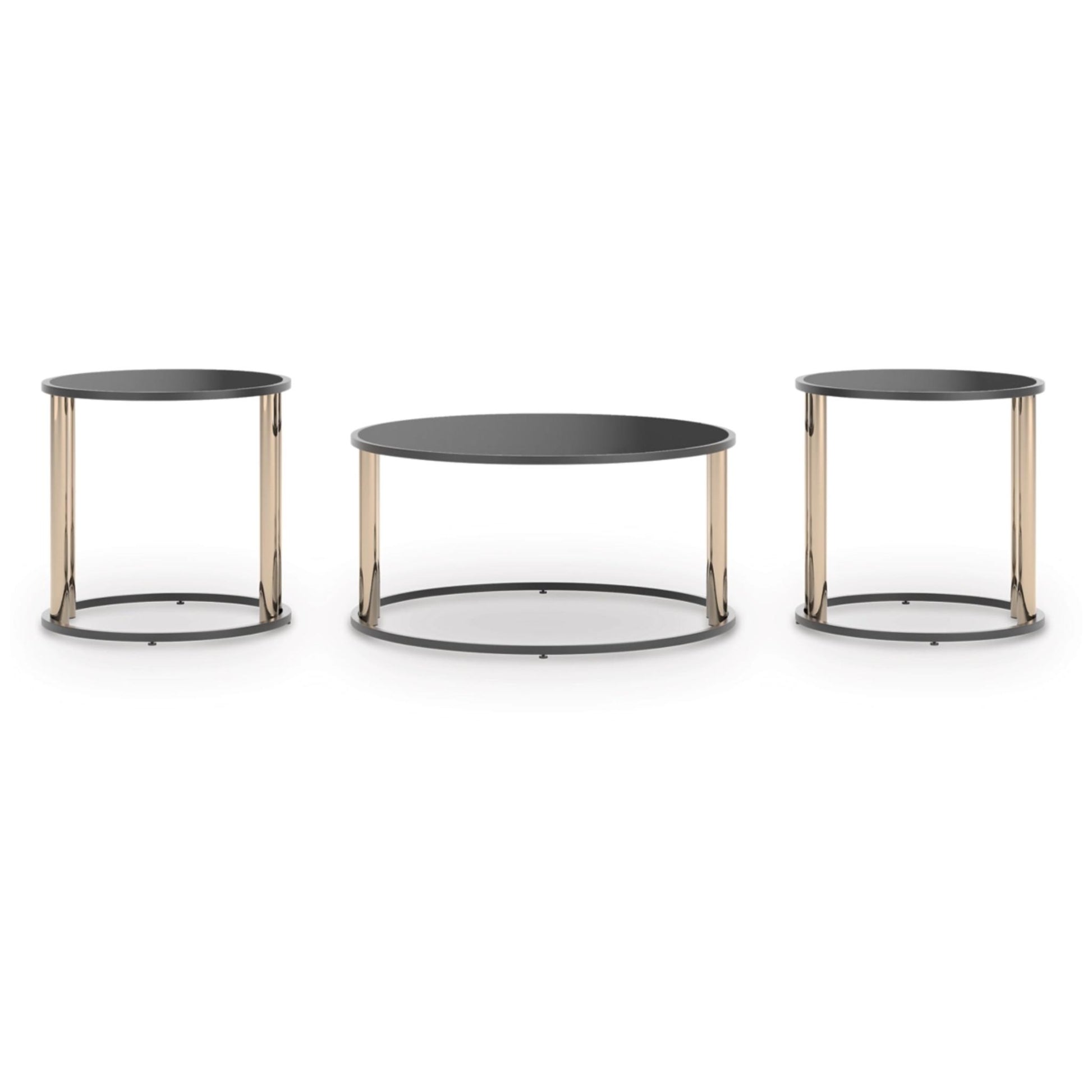 Round up a sleek, modern look with this table set. The rounded black glass tops offer the perfect perch for drinks, snacks or decor displays. Shapely brass-tone legs provide an eye-catching contrast to the matte black frames. Complete with a coffee table and two end tables, this sharp-looking table set easily complements other contemporary pieces.