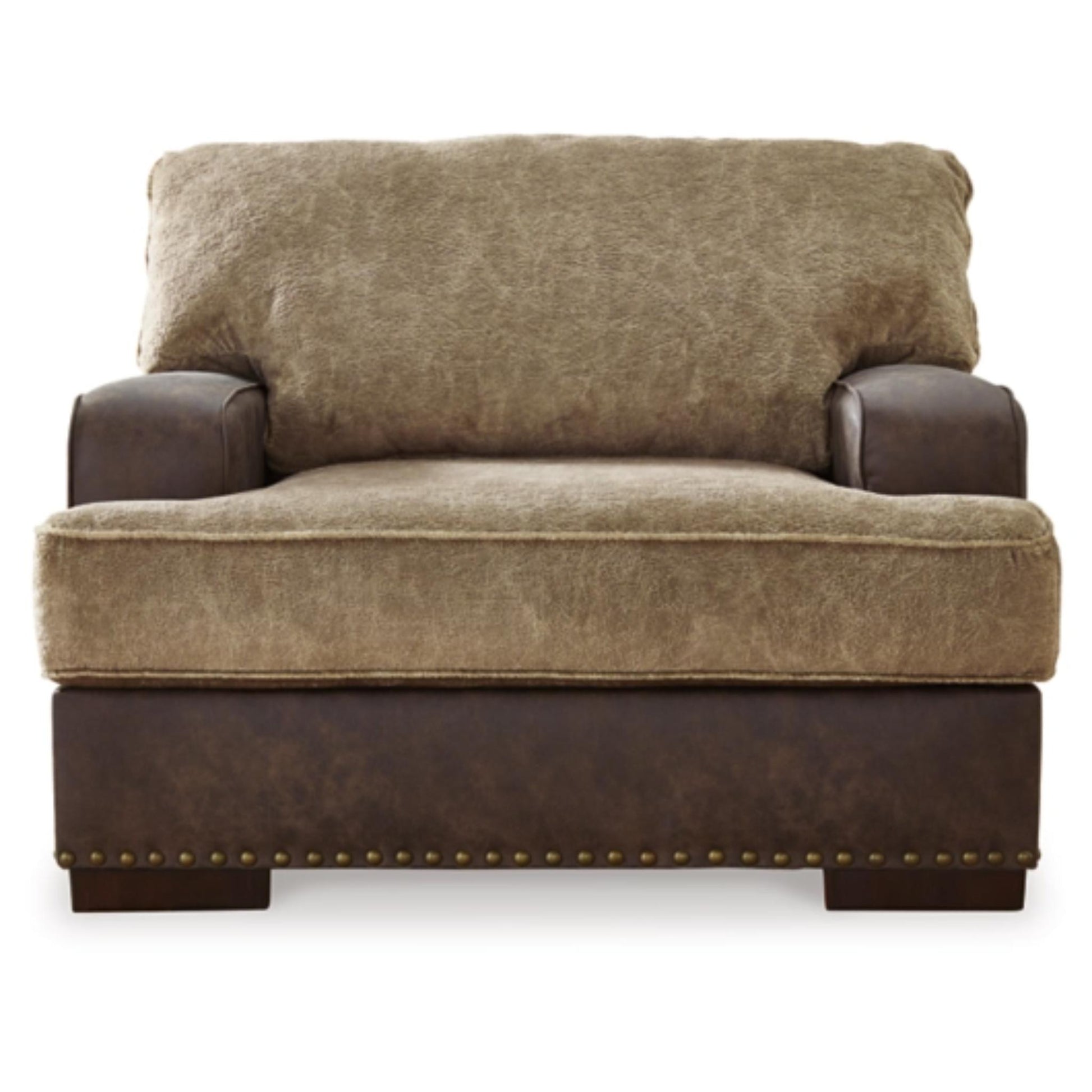 Oversized but not over-the-top, this chair is perfect for those who love the look of leather. Two textural tones provide twice the style and comfort—and incorporate an added layer of visual interest. The piece is punctuated by a subtle band of nailhead trim.