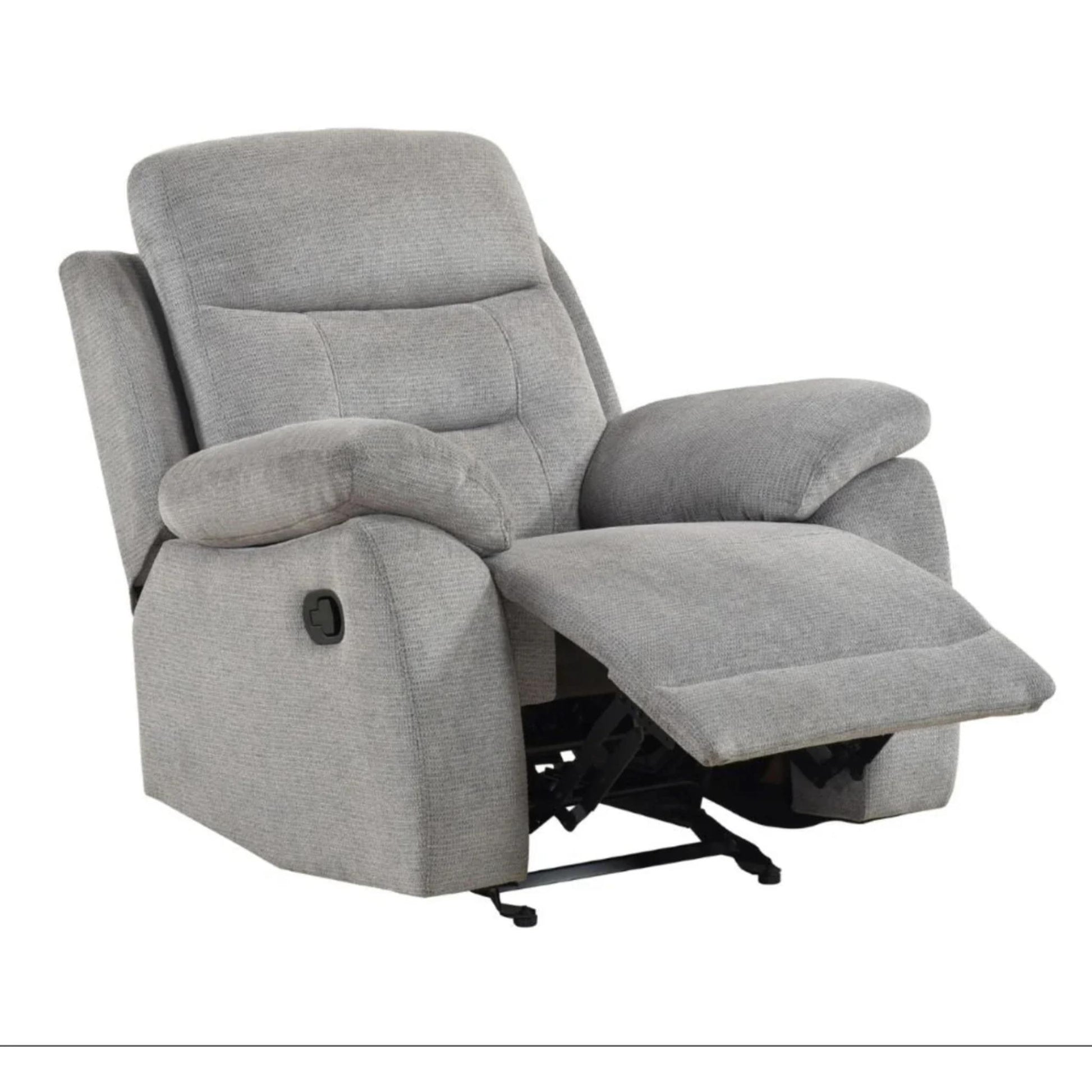 Made for the moments that matter, the Perris manual recliner brings total comfort within easy reach. Wrapped in a soft textured fabric in a subtle shade of beige, this glider recliner offers a contemporary look with just the right amount of plush cushioning. From the generously padded pillow-style arms to the dimpled back cushions, plump headrests, and padded seat construction, every detail is designed to support and bolster you in all the right places. Enjoy the gentle back-and-forth motion of the glider mechanism, and when you're ready to relax, pull on the side-mounted tab-latch mechanism to instantly recline! Whether you're winding down with a movie or catching up with family, the inviting cushions and homey design make the Perris your go-to spot for everyday lounging.