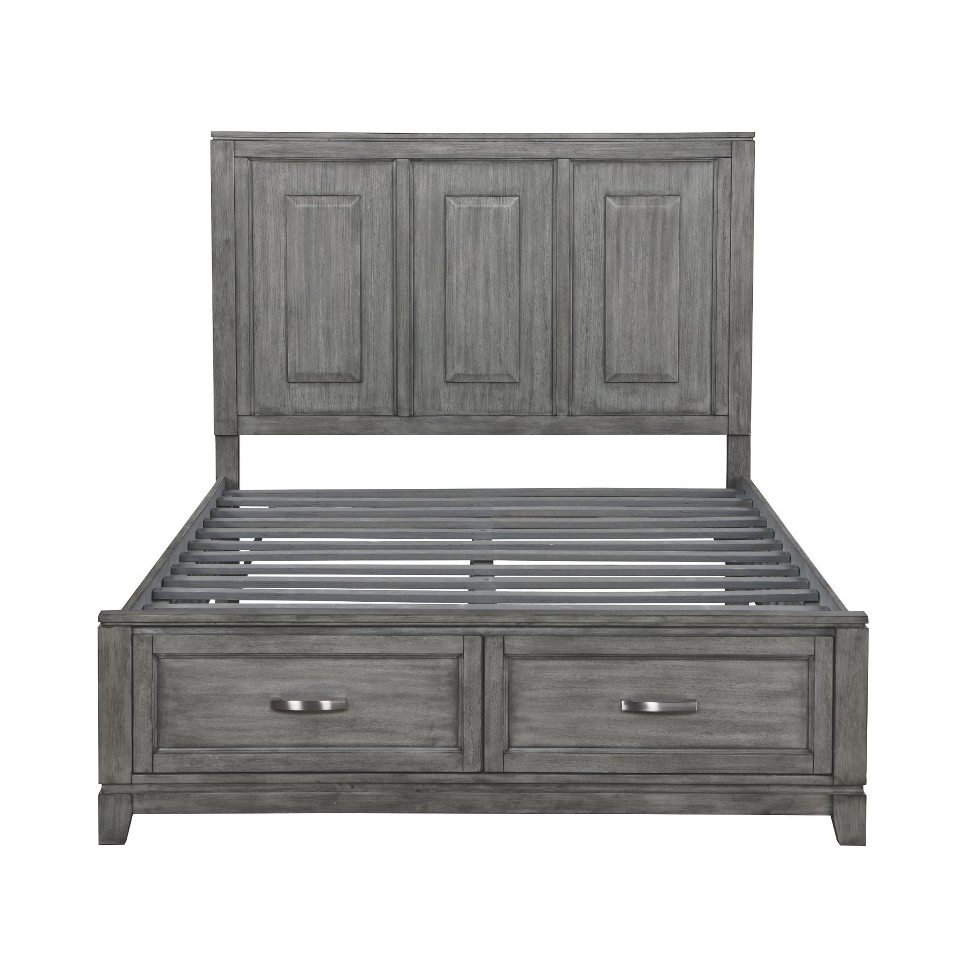 The Garretson Collection blends transitional lines with rustic styling to create an elegant addition for your bedroom. The distinct grain of the okume veneer features a gray finish. The queen bed features metal bar hardware on the picture frame drawer fronts of the low-profile storage footboard, the two drawers creating additional space within your room for soft good storage.