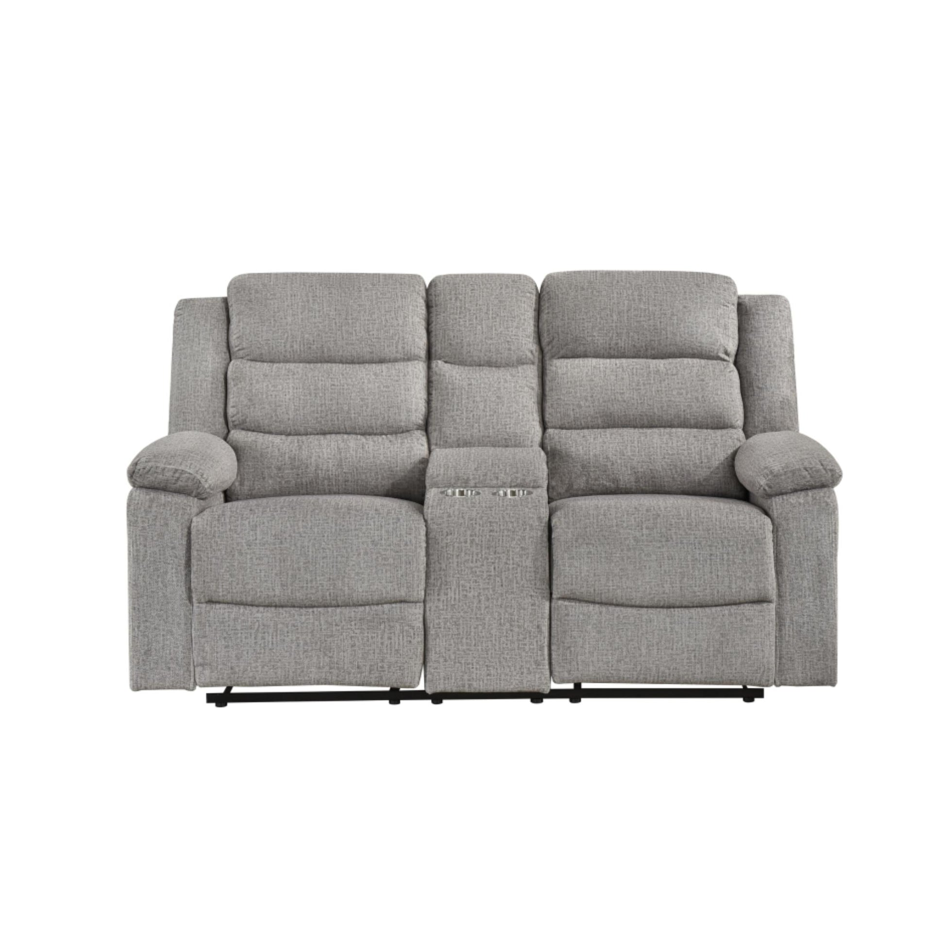 Get ready to snuggle up in style with the Tyrone manual reclining loveseat ! This charming console loveseat is the perfect addition to any cozy living space thanks to generously stuffed headrests and plush pillow armrests that invite you to relax and unwind in comfort. With an easy-to-use tab-pull latch mechanism, reclining is effortless β just pull, lean back, and enjoy the ride! This loveseat is particularly convenient thanks to a central console with storage and two cupholders so you can enjoy drinks anytime. Upholstered in extra soft brown-grey fabric with a textured appearance and sensation, this seat brings a touch of retro cozy charm to your home. Plus, with durable framing under dense foam seat construction, this loveseat is built to last. Allow the Tyrone to transform your living room into a relaxing haven and treat yourself to a blissful lounging experience.
