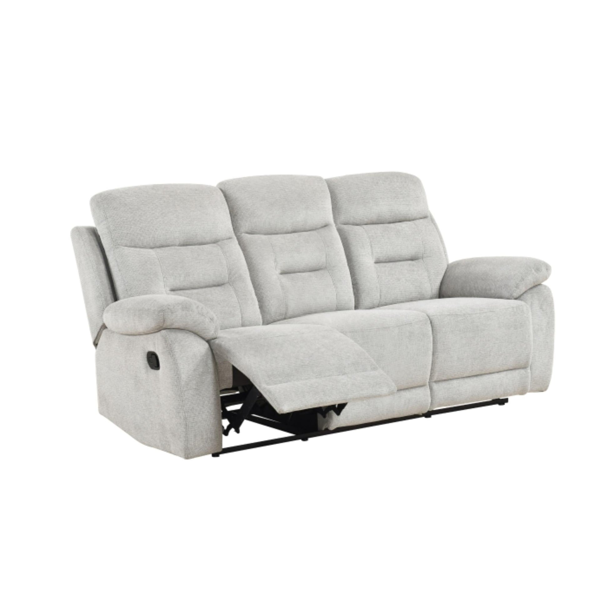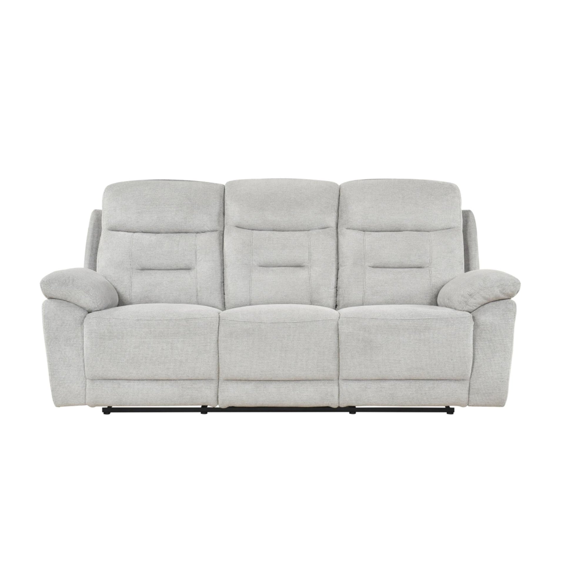 Made for the moments that matter, the Perris Reclining Sofa brings total comfort within easy reach. Wrapped in a soft textured fabric in a subtle shade of beige, this sofa offers a contemporary look with just the right amount of plush cushioning. From the generously padded pillow-style arms to the dimpled back cushions, plump headrests, and padded seat construction, every detail is designed to support and bolster you in all the right places. Pull on the side-mounted tab-latch mechanisms on either end to instantly recline so you can kick back and relax! Whether you're winding down with a movie or catching up with family, the inviting cushions and homey design make the Perris your go-to spot for everyday lounging.