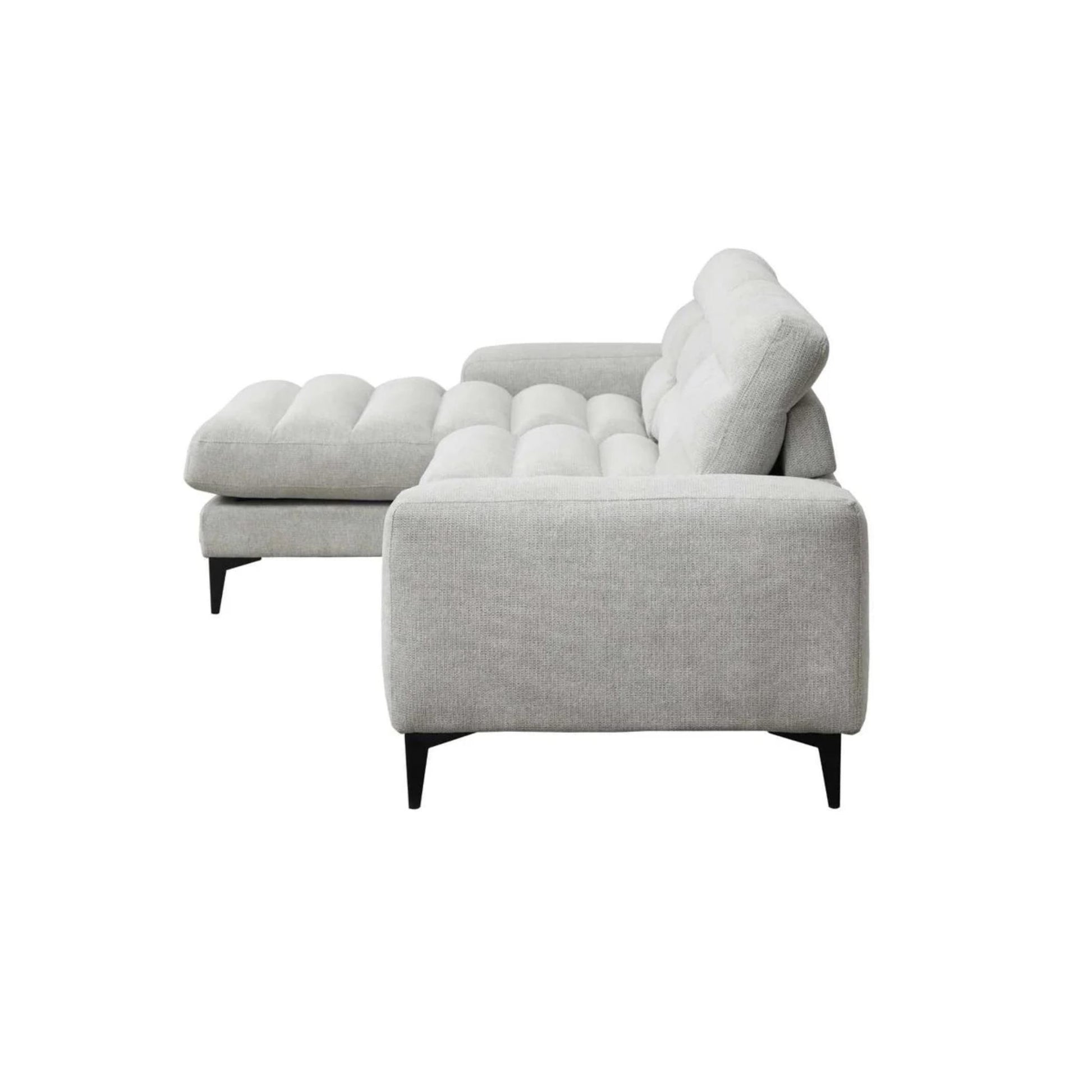 Looking to unwind after a long day? The Suki 2-Piece Sectional is the perfect blend of comfort and contemporary style. With its deep seats, wide track arms, and ultra-soft linen-like fabric, the Suki invites you to relax in total luxury. Its minimalist silhouette, light grey hue, and sleek black metal legs make it a beautiful fit for any modern living space.