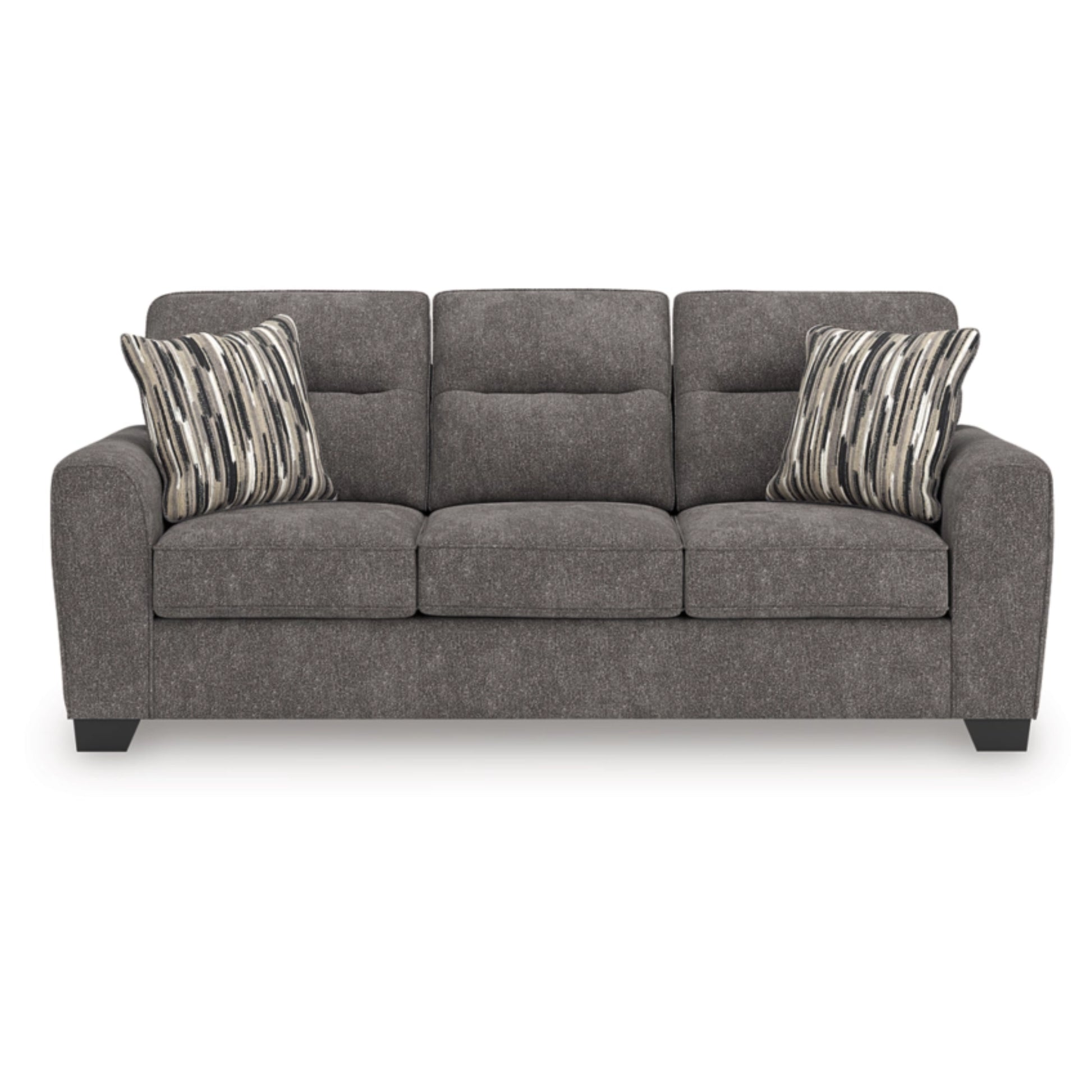 Strike a balance between the indulgent comfort you crave and the contemporary aesthetic you long for. The fabulously soft, graphite-colored upholstery of this sofa takes neutrals to new heights. Plus there's plenty of room to spread out and relax solo or with your bestie. Geometric-patterned accent pillows perfect the richly on-trend aesthetic.
